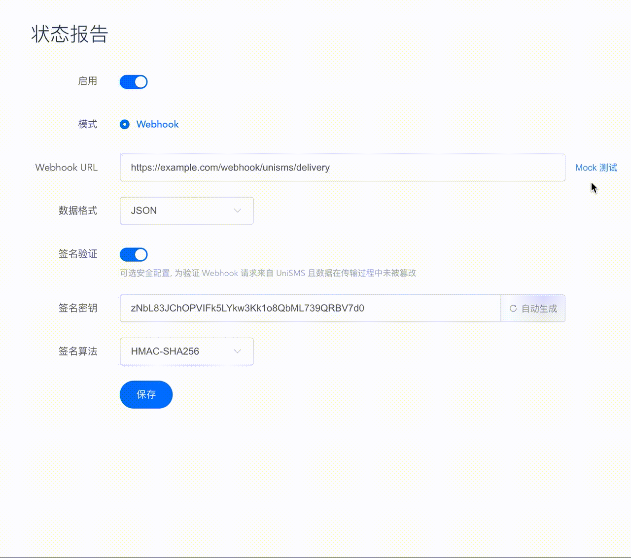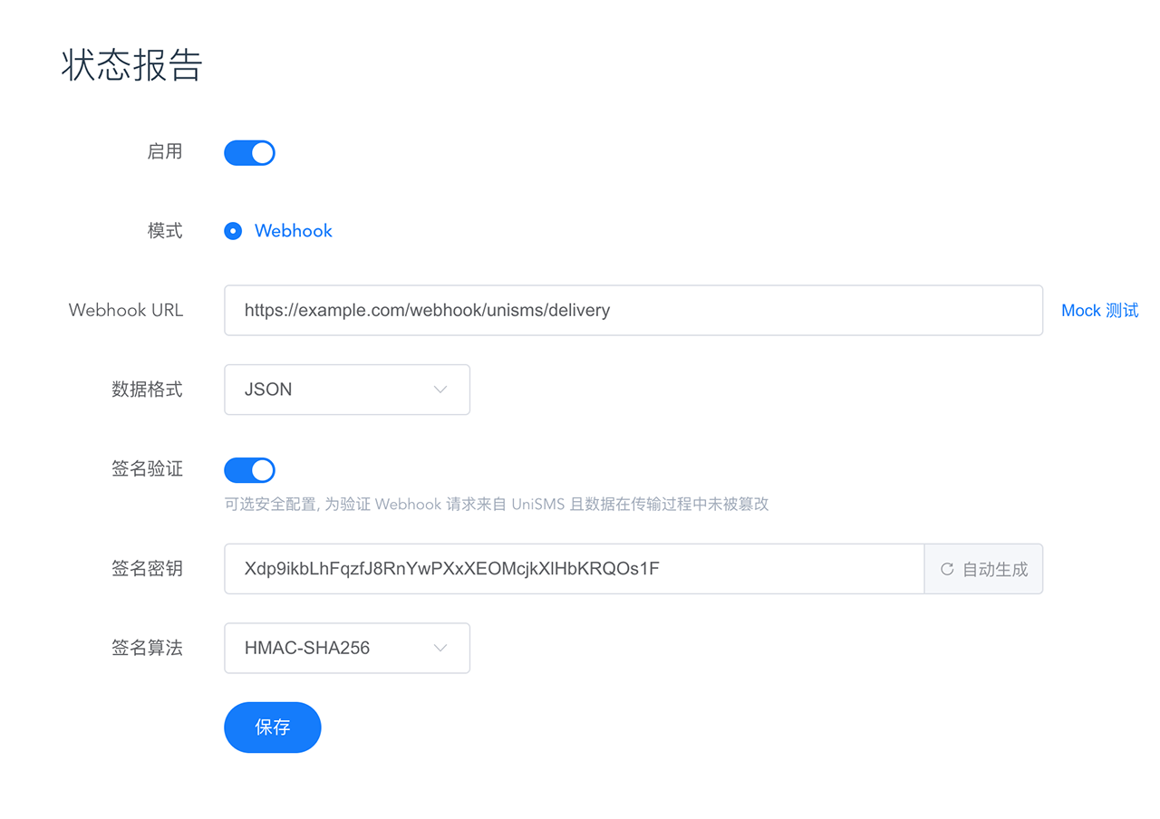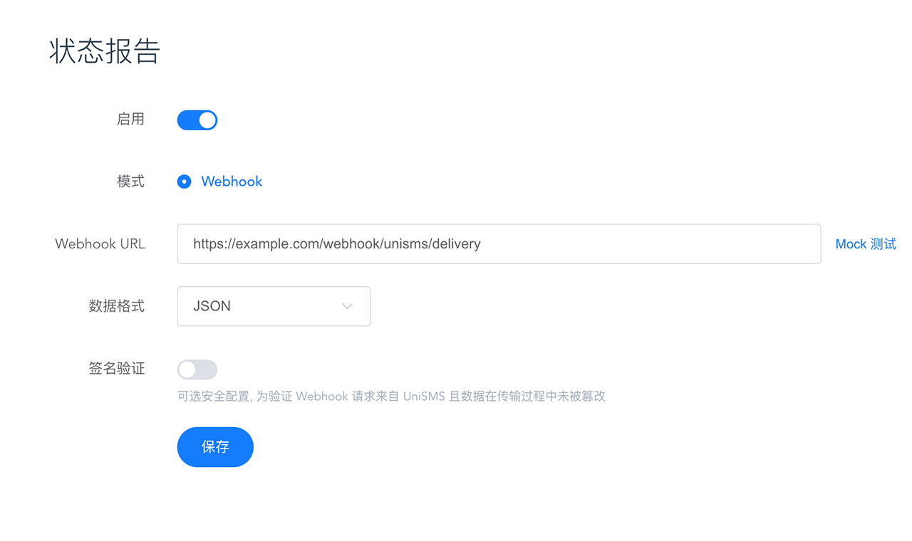 设置接收状态报告的 Webhook URL,并指定您需要接收的请求主体数据格式,支持 JSON 或 XML,默认为 JSON。即完成基础配置,准备接入。